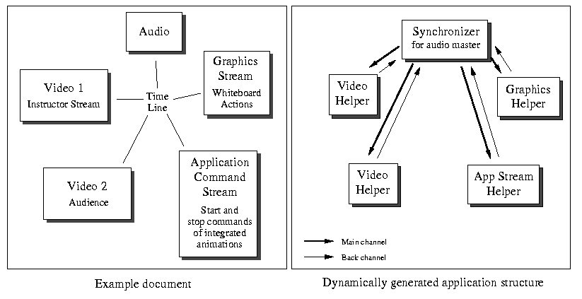 Das zuvor beschriebene Verfahren der MPEG-Wiedergabe unter wahlfreiem Zugriff haben wir, wie oben bereits erwähnt, in einem Prototyp eines MPEG-Players implementiert, der bereits für verschiedene Plattformen existiert (Windows95/98, Unix-Derivate). Der Prototyp fungiert als Helper-Applikation für das in [14] genauer beschriebene Applikationsmodell, daß ebenfalls bereits implementiert ist und routinemässig für die Wiedergabe von AOF-Dokumenten genutzt wird (vgl. [1],[14]). Dem Applikationsmodell liegt eine Aufsplittung der Wiedergabe auf mehrere nahezu unabhängige Präsentationsmodule (ein Synchronizer und verschiedene Helper) gemäß der Zusammensetzung der einzelnen Medienströme im AOF-Dokument zugrunde (siehe Abb. 5). Der Synchronizer gibt dabei den Audiostrom wieder und sorgt für die Synchronisierung der einzelnen Ströme. Dazu werden zwischen dem Synchronizer und den einzelnen Helper-Applikationen Kommunikationskanäle geschaltet, über die insbesondere die Zeitstempel für die Synchronisierung übertragen werden (siehe Abb. 6). Da die Helper-Applikationen die ihnen zugeordenten Medienströme selbständig wiedergeben und die Wiedergabe anhand der empfangenen Zeitstempel synchronisieren können, ermöglicht das Applikationsmodell damit die oben genannte dynamische Frameraten-Anpassung.